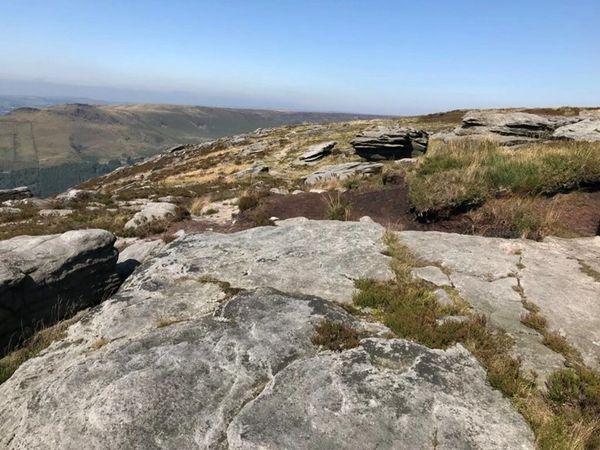 From the top you will see Chew Resevior, and can turn right to go over to the stones at the head of Dovestones, or you can take a walk on wild side, and turn left, to go over the tops which straddle three reservoirs!